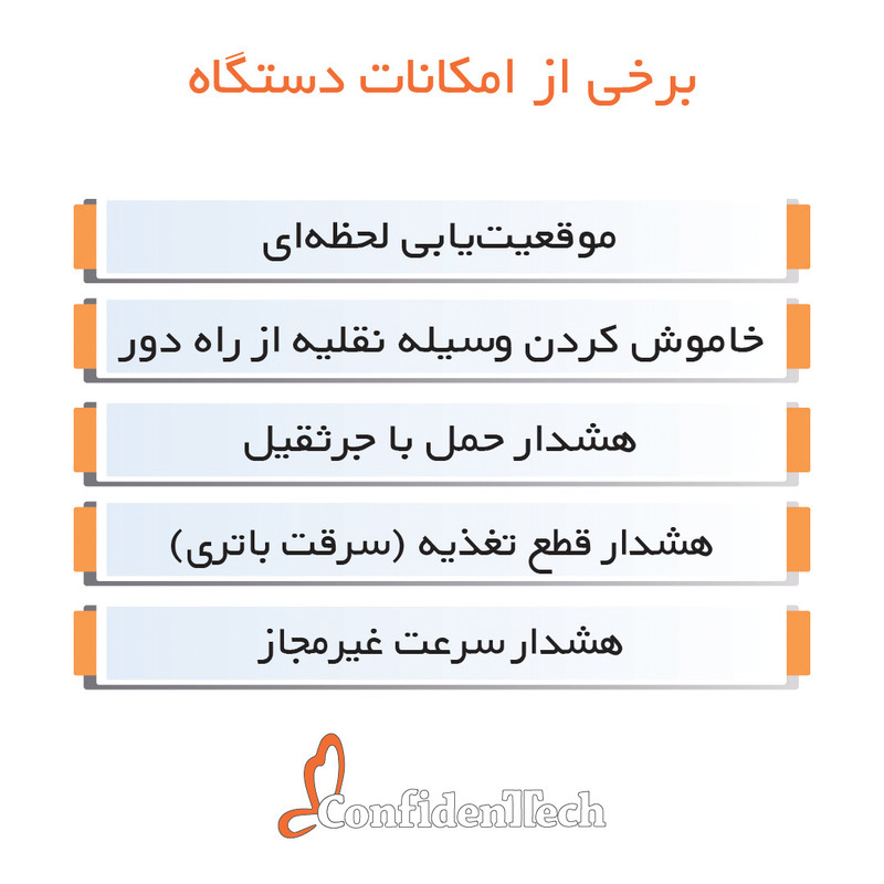 ارتباط با تاکسی متر , ارتباط با ماژول های دیجیتال , امکان استفاده بهشکل خودرویی , دارای سرور اختصاصی , سنسور GPS , قابلیت ارتباط صوتی , قابلیت به روز رسانی , کلید SOS , گزارش مسافت طی شده , هشداردهنده سرعت , هشداردهنده وضعیت باتری