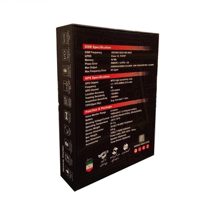 امکان استفاده بهشکل خودرویی , دارای سرور اختصاصی , سنسور GPS , قابلیت کنترل با پیام , کلید SOS , گزارش مسافت طی شده , هشداردهنده سرعت , هشداردهنده وضعیت باتری