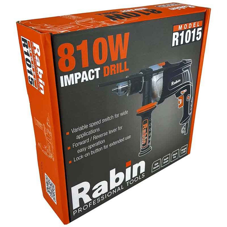دستگاه فوق یکی از محصولات شرکت رابین بوده که علی رغم کیفیت بالای خود ازقیمت مناسبی برخوردار است.اگر قصد تهیهی یک دریل چکشی مناسب با قدرتی قابل قبول دارید، میتوانید از دستگاه فوق استفاده کنید. این دریل از توانی برابر 810 وات برخوردار است و از قابلیت کنترل سرعت گردش سود میبرد. میزان سرعت گردش این دستگاه توسط کلیدی چرخشی که روی شستی قرار دارد تنظیم میشود. بازهی سرعت چرخش این دستگاه 2800-0 دور بر دقیقه است. از دیگر مزایای این دستگاه میتوان به قابلیت چرخش ساعتگرد و پادساعتگرد آن اشاره کرد.این دستگاه دارای بدنه نیمه فلزی بوده و سه نظام این دریل چکشی از نوع 13 میلیمتری آچارخور بوده که حداکثر قطر سوراخکاری آن در چوب، فلز و مصالح به ترتیب برابر 30، 13 و 16 میلیمتر است. با کمک این دستگاه میتوانید با دقت و تسلط بیشتری به کار خود بپردازید که این ویژگی به دلیل وجود دستهی کمکی و قفل سوییچ این دریل حاصل شده است. این دسته قابل تنظیم بوده و از قابلیت چرخش 360 درجه سود میبرد. دستگاه فوق با نام (R1015 ) شناخته میشود و یکی از تولیدات شرکت «رابین» (RABIN) است.