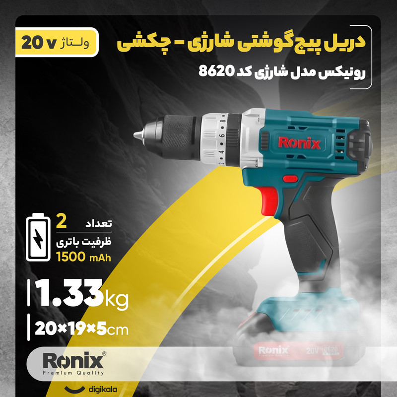 منبع تغذیه این دستگاه، دو عدد باتری لیتیومی ۲۰ ولت است که به شما اجازه میدهد بدون وقفه و با همراه داشتن باتری یدک، به کار خود ادامه دهید. گیربکس دو سرعته و قابلیت کنترل سرعت الکترونیکی، کنترل دقیقی بر روی قدرت دستگاه فراهم میکنند. سهنظام ۱۰ میلیمتری خودکار، تعویض سریع و آسان سریها را ممکن میسازد. بدنه مقاوم، چراغ LED برای کار در محیطهای تاریک و نشانگر میزان شارژ باتری، از دیگر ویژگیهای کاربردی این دریل ۱.۳۳ کیلوگرمی است. این محصول ساخت کشور چین، به همراه شارژر، باتری اضافه و کیف حمل ارائه میشود. در نهایت، دریل پیچ گوشتی شارژی رونیکس مدل 8620 با قابلیتهای متعدد، یک جعبه ابزار کوچک و قدرتمند برای هر خانه و کارگاهی است.