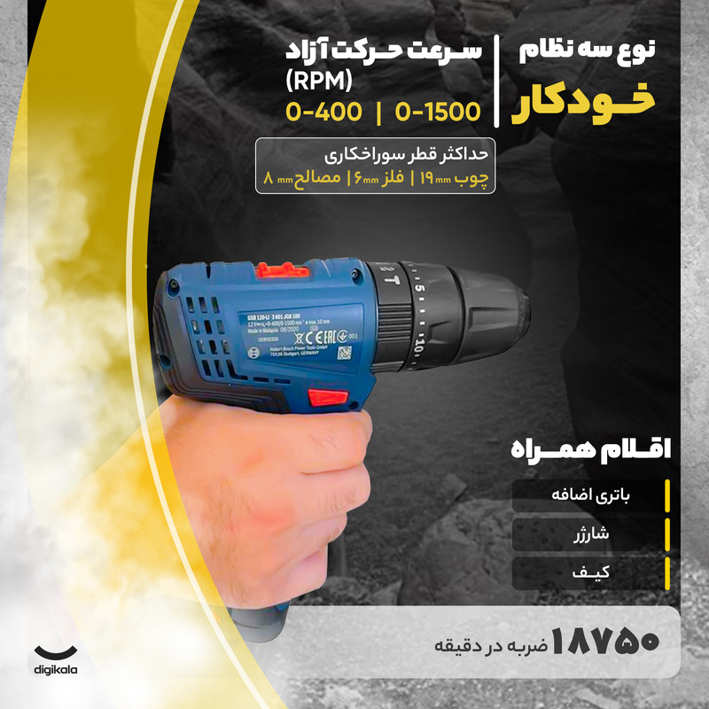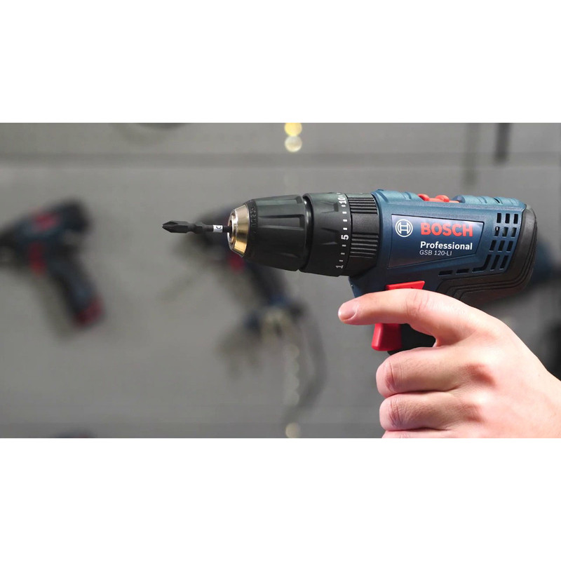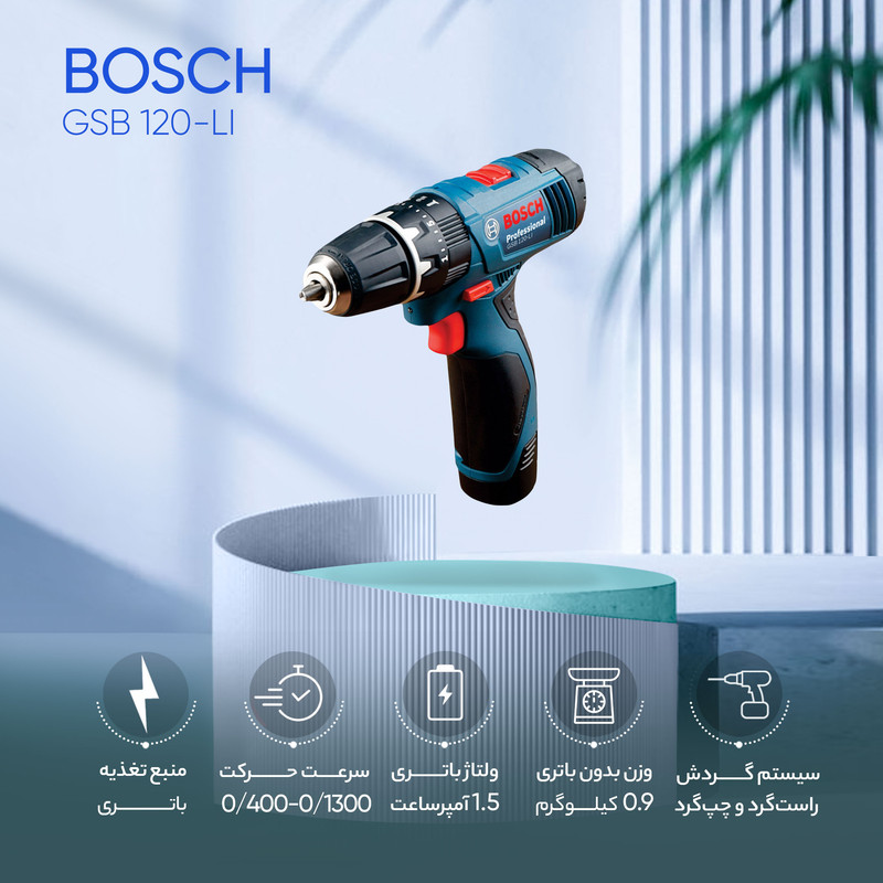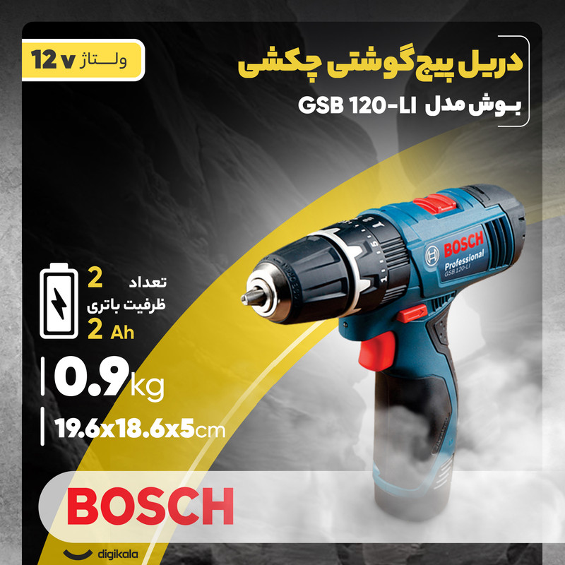 دریل پیچگوشتی چکشی شارژی فوق یکی از محصولات تولیدی شرکت «بوش» (Bosch) است که تحت عنوان مدل «GSB 120-LI» به بازار عرضه میشود. این دستگاه انرژی موردنیاز خود را از یک باتری لیتیومیونی تامین میکند. این باتری ولتاژی 12 ولتی دارد و ظرفیت آن 1500 میلیآمپرساعت است. این ابزار از قابلیت کنترل سرعت برخوردار است و میتوان سرعت چرخش آن را در دو بازهی 0 تا 400 و 0 تا 1300 دور بر دقیقه تنظیم کرد. وجود حالت چکشی در این دستگاه موجب میشود تا بتوانید از آن برای سوراخکردن سطوح ساختهشده از مصالح ساختمانی مانند سطوح گچی و سیمانی استفاده کنید. این دستگاه کوچک گشتاور مناسبی دارد و در صورت نیاز میتوانید میزان گشتاور آن را در 20 حالت مختلف تنظیم کنید. سهنظام این محصول از نوع خودکار 10 میلیمتری است و برای قراردادن مته یا سری پیچگوشتی روی آن نیازی به آچار نخواهید داشت. شرکت بوش بههمراه این دستگاه یک باتری اضافه نیز عرضه میکند تا در صورت تمامشدن شارژ باتری، سریعا آن را جایگزین کرده و به کار خود ادامه دهید.