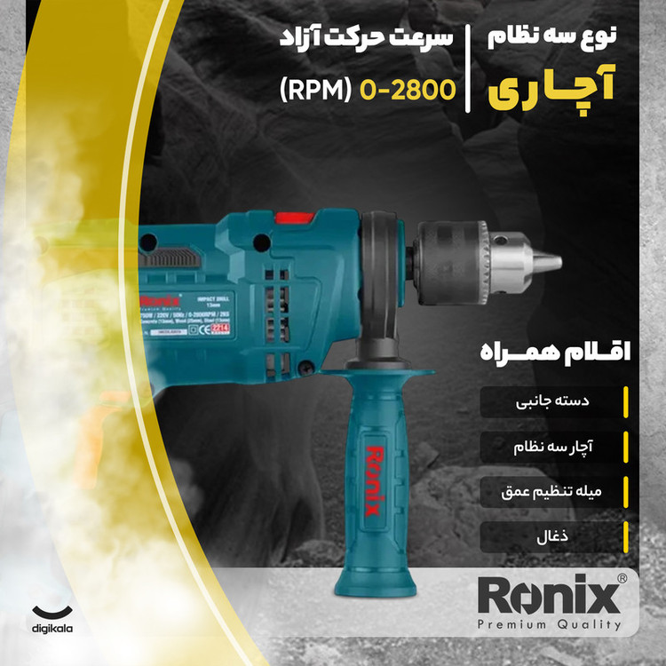 این دریل با موتور ۸۰۰ وات و سرعت گردش متغیر تا ۳۲۰۰ دور در دقیقه، عملکردی قدرتمند و سریع را ارائه میدهد. مجهز به سیستم چکشی، امکان کار با انواع مصالح ساختمانی را فراهم میسازد. همچنین، سهنظام ۱۳ میلیمتری با قفل سریع، تعویض مته را بدون زحمت ممکن میسازد.