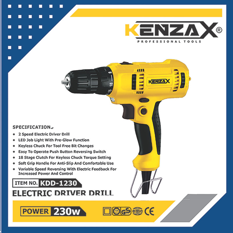 شرکت «کنزاکس» (Knzax) چند مدل پیچگوشتی برقی و شارژی را عرضه میکند که مدل KDD-1230 یکی از این محصولات است. این دستگاه یک پیچگوشتی برقی محسوب میشود. موتور این ابزار 230 وات قدرت دارد و سرعت گردش این موتور بین 0 تا 1800 دوربردقیقه تغییر میکند. با توجه به استفاده از گیربکس صنعتی دو سرعته قابلیت انتخاب گری برای دور کند 0 تا 480 دور بر دقیقه ؛ دور تند 0 تا 1800 دور بر دقیقه در گشتاورهای مختلف متناسب با متریال در اختیار کاربر میگذارد . با تهیه انواع سریهای پیچگوشتی و اتصال آن به دستگاه میتوانید از این ابزار استفاده کنید. قابلیت گردش به هر دو جهت برای باز کردن یا بستن پیچ، برای این محصول در نظر گرفتهشده است. وزن این مدل به حدود 980 گرم میرسد. لازم است بدانید دریل پیچگوشتی کنزاکس مدل KDD-1230 دارای کابلی با طول 3 متری با روکش ضخیم پلاستیکی (Rubber) میباشد . همچنین در بسته بندی KDD-1230 یک جفت ذغال یدکی ئیزارایه شده است . دریل پیچگوشتی کنزاکس مدل KDD-1230 دارای بلبرینگ حرفه ای و کلید گازی ضد غبار و اهرم انتخاب وضعیت چپگرد و راستگرد مطابق با استاندارد های اروپا است.برای این محصول کلید قفل کن جهت استفاده مداوم در پوسه مونتاژ نیز در نظر گرفته شده است. سیستم گردش چپگرد و راستگرد برای این محصول باعث میشود در حالت پیچگوشتی، بهراحتی پیچها را باز و بسته کنید و در حالت دریل، ورود و خروج مته را با سهولت بیشتری انجام دهید. گشتاور موتور این محصول در 18 حالت مختلف قابل تنظیم بوده و در بیشترین مقدار به 18 نیوتنمتر میرسد. با کمک قابلیت تنظیم گشتاور میتوانید میزان نیروی وارده به سهنظام را تغییر دهید. دسته این محصول با طراحی ارگونومی و روکش TPR نرم جهت جلوگیری از خستگی و لغزش و مقاوم در برابر ضربات حین کار تولید شده است ؛ این محصول به چراغ ال ای دی در انتهای دسته مجهز شده است که با تابش بروی سطح کار انجام فعل را در محیط های کم نور را نیز مقدور مینماید ؛ همچنین این محصول به آویز کمری استیل جهت راحتی کاربر حین کار مجهز گشته است. سه نظام این کالا از مدل اتوماتیک دو تکه بوده ؛ ظرفیت آن 10 میلیمتر است ؛ ظرفیت سوراخکاری آن در چوب 26 میلیمتر و در استیل 10 میلیمتر میباشد .