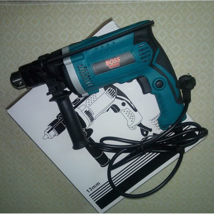 دریل چکشی برقی برند باس (BOSS) یکی از بهترین دریل های چکشی (ضربه ای) موجود در بازار می باشد که طرح آن دقیقا مشابه دریل ماکتیا می باشد و نیز ازکیفیت بالایی برخوردار است و میتواند نیازمندی شما به انجام امور فنی و ساختمان را به راحتی پوشش دهد. این دریل برقی دارای جنس بدنه بسیار مقاوم نسبت به ضربه بوده و حداکثر قطر مته ای که در سه نظام آن قرار میگیرد 13 میلی متر (13mm) می باشد. دریل چکشی برقی باس دارای کلید گازی (جهت تغییر سرعت به نسبت فشار وارده به کلید) و کنترل دور گردش بوده و همچنین دارای قابلیت چکشی (ضربه) نیز می باشد. این مدل دریل برقی دارای یک دستگیره جهت کنترل بهتر دریل در حین انجام کار مخصوصا در حالت چکشی می باشد تا دقت اپراتور را به بیشترین میزان برساند.