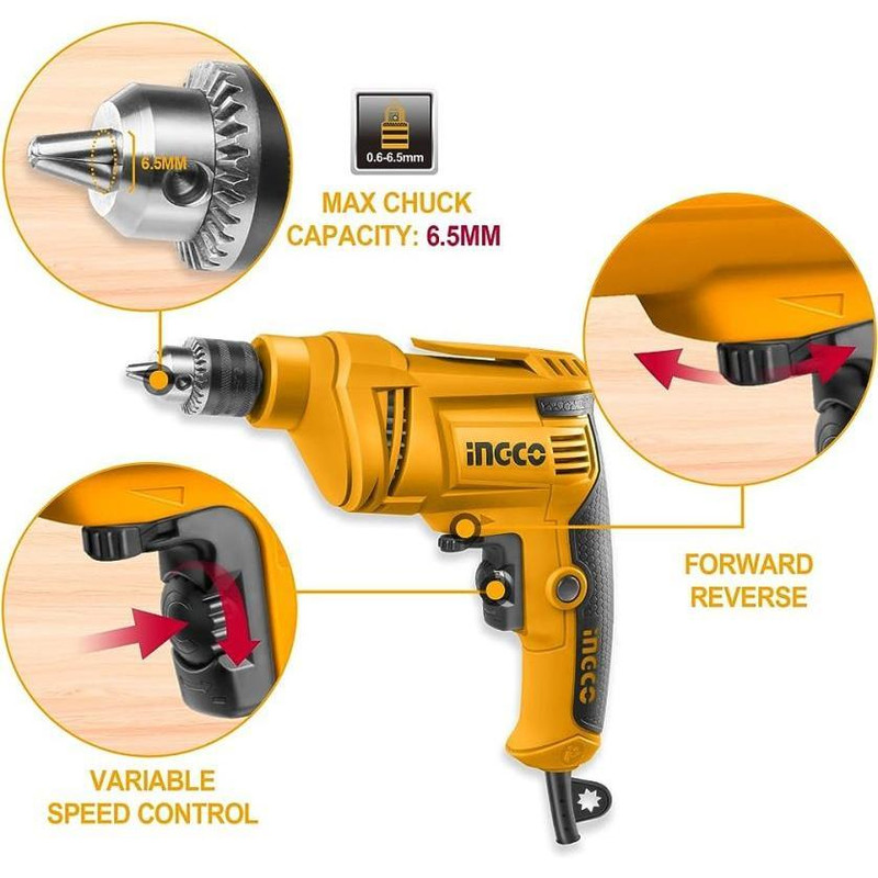 دریل 500 وات برقی اینکو مدل ED500282 یک دریل ساده با موتور قدرتمند است که قادر است سرعت گردش بی بار 0 تا 3300 دور در دقیقه را برای انجام کاربری های مختلف خانگی و صنعتی شما ایجاد کند. این دریل نارنجی رنگ و زیبا دارای دیمر کنترل سرعت به صورت پیچی است تا برای سوراخکاری انواع سطوح فلزی، چوبی، ام دی اف و سایر مواد مختلف در انواع مشاغل و مصارف نجاری، آهنگری، نصابی، تاسیسات و مونتاژ به خوبی به کار شما بیاید. شرکت سازنده در طراحی این دریل ویژگی بسیار کاربردی گردش به صورت چپگرد و راستگرد را در نظر گرفته است که این تغییر جهت گردش دریل به کمک یک کلید به صورت زائده در زیر دسته انجام می پذیرد. این محصول ساخت کشور چین است.