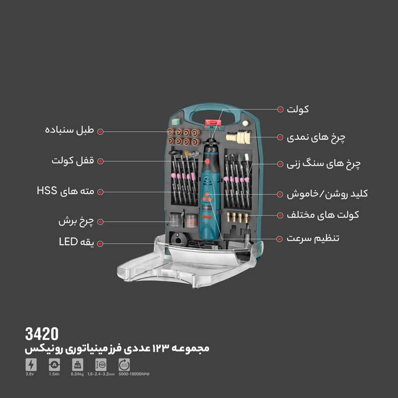این فرز مینیاتوری مجهز به یک موتور DC 3.6 ولت است که سرعتی بالغ بر 18000 دور در دقیقه تولید کرده و به ابزارگیر 3.2 میلی متری خود منتقل می کند. سرعتی که در 6 حالت مختلف، در بازه 5000 تا 18000 دور در دقیقه و متناسب با سطح کار شما قابل تنظیم است.
