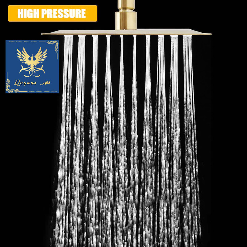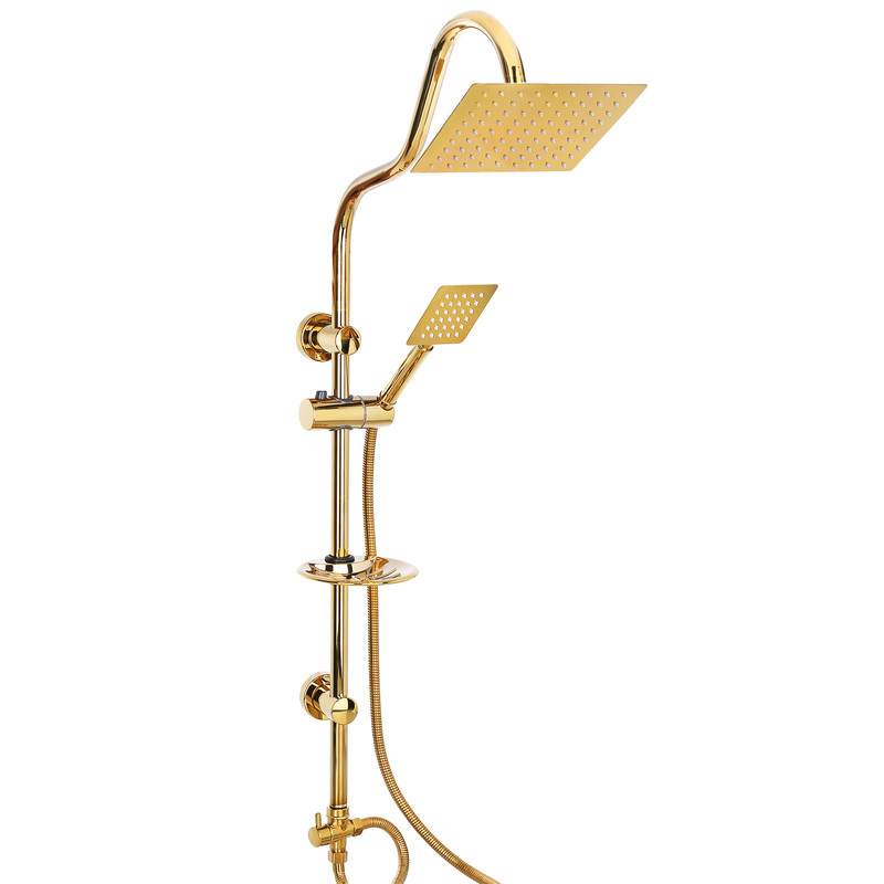 سه راه با کیفیت، شلنگ استیل ریز بافت، گوشی و سردوش استیل، جاصابونی، پایه های با پوشش طلایی، آسانسوری دکمه ای قابل تنظیم، شلنگ رابط دوش، لوله استیل، واشر های اب بندی و پیچ و رول پلاک جهت نصب.